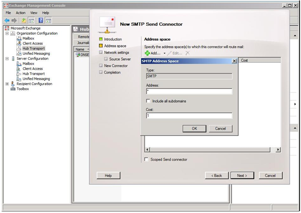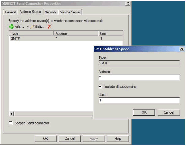 | In the first Screen Type a name for your SMTP Connector (ex: DNSExit Send Connector) and leave Custom in the selection list and click "Next" In the address space screen press "Add" and type the caracter star in the "Address" field. Leave 1 in the "Cost" field to make it as primary and press "OK" |
