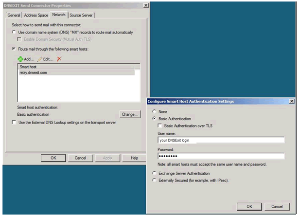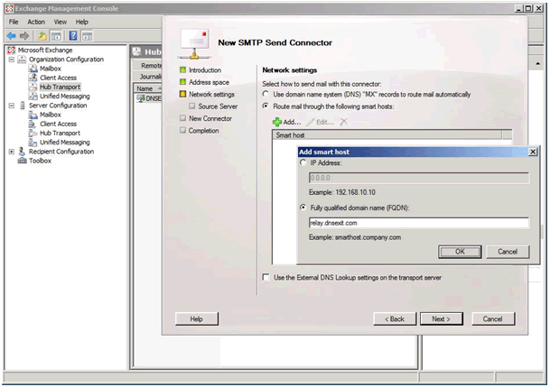First, you may want to check if your ISP is blocking outgoing SMTP port by use DOS/Unix command: c:\> telnet relay.dnsexit.com 25 If the port is open, you should see some messages like Connected to relay.dnsexit.com (64.182.102.185). If there is no response at port 25, you ISP must have blocked the port. To go around port 25 blocking that is common practice by a lot of ISPs, we have other ports open for your mail relay. You can try port 26, 940, 8001, 2525, 80 by using the same telnet command by telnet to the alternative port instead of 25. If the connection gets responses from the alternative SMTP port, you should use that port instead of 25 when setting up Smart Hosting. Here are the settings using in Exchange 2007 |