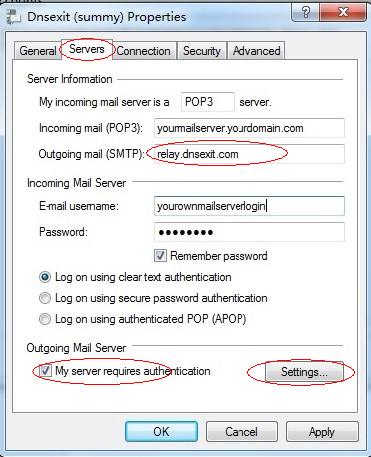 4. In the new window select the Servers tab change Outgoing mail (SMTP) to relay.dnsexit.com and check My server requires authentication